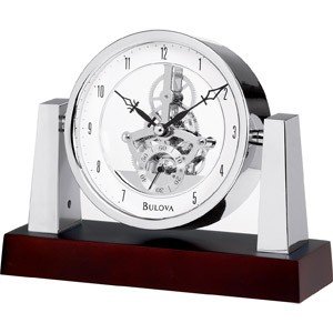 LARGO. Solid wood base, dark mahogany finish. Chrome finish pivoting clock housing and supports. Skeleton movement with seconds sub-dial. Protective glass lens. H: 6 W: 7.5 D: 2.5
