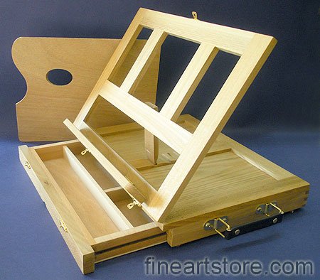 Both portable and compact this desk easel features a folding easel that adjusts to four positions. The Marquis can accommodate a canvas or drawing board up to 14 inches wide. Cleverly designed it has a drawer with three compartments to hold brushes paints pencils scissors and other essential gear. The drawer latches securely for storage or during trips. Folded dimensions are 13-1/4 inches wide by 10-1/2 inches high by 2-3/4 inches deep. Very light weight. Includes a wooden palette that fits into the drawer and comes with a sturdy handle for carrying.