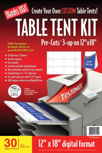 Pre-Cut Digital Printable Table Tent, 3-UP on 12" X 18",10 Sheets / 30 total Table Tents, 80 Lb. Laser Gloss Cover, Finished Product Size 4" X 5 5/8" Table Tent; Copier, Laser Printer, and Offset Press Compatible, Pre-Cut For Clean Separation, Scored for Crisp Folds & Interlocking Tabs, Fits Copiers and Presses with 12" x 18" capacity
