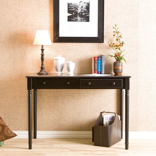 - Designed with transitional appeal, this writing desk is sure to create a wonderful accent among your decor.- Two deep drawers are accessible from the front of the desk with dual color matched knobs. The elegant satin black finish creates a blend of styles that makes this piece blend with traditional or contemporary decor.