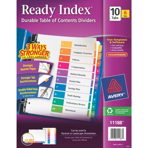 Consistency and efficiency rely on excellent documentation. These Ready Index Table of Contents Dividers help you organize important information so it can be located quickly and easily. The 10 preprinted, numbered multicolor tabs can be used in either landscape or portrait format. And with free templates from avery.com, you can customize the included title page and print it from your laser or inkjet printer in minutes. Now there's an organizational solution that can raise your business to new heights. Organize your documents quickly and easily Print section titles for reports and manuals onto the table of contents page Preprinted tabs 1-10 (white type on multicolor tabs) Customize with free templates from avery.com Preprinted in portrait and landscape formats; ideal for PowerPoint presentations Three-hole punched Compatible with both inkjet and laser printers Preprinted tabs and customizable table of contents allow fast, easy, professional results