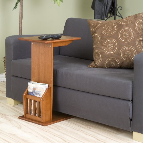 Crafted from solid Asian hardwoods with a rich walnut finish, this handy snack table makes an ideal accent piece for the living room, playroom, or even bedside. The -inchC-inch shape allows this unit to be nestled up against the couch as a drink, snack, remote, or book holder while the back side hosts a useful magazine holder. This wonderfully useful table is a smart addition to any home. - 15-inch by 11-inch by 24-inch Tall - Convenient magazine holder - Slides flush against couch face - Rubber wood Construction - Assembly required