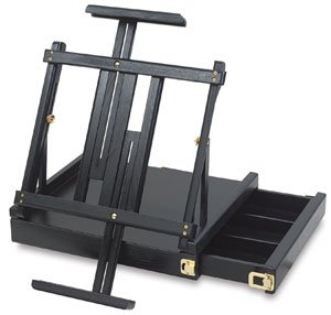 The Ravenna Easel, crafted of seasoned elm, travels compactly as a sketchbox, and is approximately the size of a laptop computer. Place it on any flat surface, and the easel unfolds and expands to hold canvases up to 34 tall.