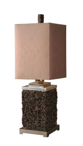 This lamp features intertwined rattan with antique nickel plated metalaccents. The square shade is a light brown textile with subtlepinstripe.