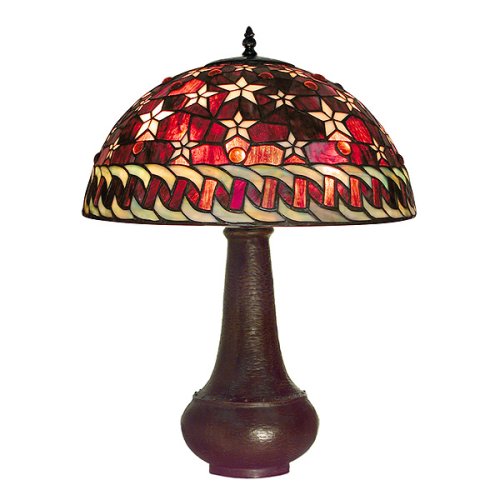 - Pink stars twinkle on a stunning red- and amber-hue mosaic in this Tiffany-style design made with more than 200 pieces of individually cut glass- Elegant stained glass shade is posed atop a sculptural onion-shaped base made of white zinc in antiqued finish