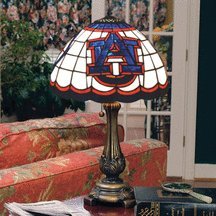 The Memory Company's popular stained glass table lamp will continue to be a welcome addition in homes and offices; with its warm glow illuminating the hearts and spirits of NCAA fans everywhere. The hand-cut Tiffany-style glass shade and the cast metal base say "quality" and add an air of distinction, class and charm to any room. The shade has the Auburn Tigers colors and logo. This lamp uses 60 watt bulbs.