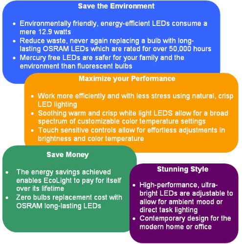 * High efficiency, ultra bright LEDs require a mere 2 watts when dimmed for ambient lighting and a maximum of 12.9 watts for full brightness in direct task lighting.
