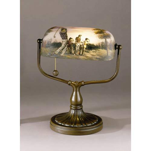 Golf Handale Tiffany Hand Painted Table Lamp introduces this lovely hand painted glass with young lads swinging away on the golf course with green fields and trees. Antique bronze body resembles a trophy, raising both arms. Lamp width: 11" - Lamp height: 17" - Shade width: 11" - Shade height: 4" Rectangular - Bulb: 60W Medium Base - on/off pull chain switch.