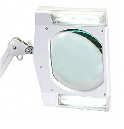 Sturdy base is 12" x 8.5"w x 1.25". Great for reading, retailers and jewelers. Two arms with three-way positioning. Uses two Energy-Saving Full Spectrum 9watt lamps and produces 1,200 lumens (600 lumens each). The dual-bulb design allows for even light distribution over any work surface. Brilliant full spectrum light equal to 100watt bulb. Long-life lamps will last up to 10,000 hours. Magnification of 1.5x. Comes with a full two-year warranty on the lamp and one year on the bulb.