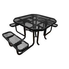 Metal Mesh Picnic Table ADA Compliant Octagonal Table - Expanded Metal - Surface Mounted Built to last and highly attractive, these commercial grade picnic tables and benches are constructed of 9 gauge expanded metal that features a diamond pattern. Finished to endure the elements with virtually no maintenance. Tops and seats are coated with a rugged thermoplastic layer that's attractive and durable. Surface mounted models allow floor anchoring for stability. Galvanized tubular steel legs and supports are protected with a black powder coat finish and designed for strength and stability. Table top features a 2 diameter opening to accept an umbrella with a pole of up to 1-1/2 diameter ( Umbrellas & Umbrella Bases sold separately). ADA compliant models have 1 less bench for handicap accommodation. Measures 80"W x 30 1/2"H with 12"D x 18"H benches. Benches are 38"L. Easy assembly. 0.00 L. 0.00 W. 0.00 H.