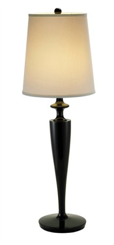 Lamp has a black sculpted body and a round base with matching wood finial. Ivory poly/cotton fabric shade. Shiny black finish. Three-way rotary switch.