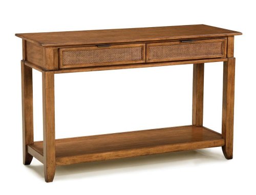 Features: Poplar hardwood construction with Cherry veneers and engineered woods Multi-step mahogany finish Table features easy glide drawers with woven cane fronts Display , storage shelf on bottom. Easy to assemble.