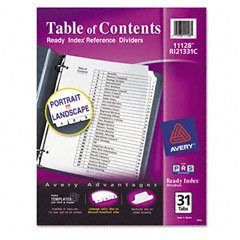 The printable Table of Contents coordinates with preprinted tab titles. Now three ways stronger to last longer-stronger heavier weight paper, stronger tab reinforcements and double-sided hole reinforcements. Global Product Type: Index Dividers-Preprinted; Index Divider Size: 11 x 8 1/2; Tab Title(s): 1-31; Tab Color(s): White.