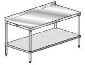 MATERIAL TOP 1-7/8" turn down on 3 sides. Rear has a 2-3/4" splash. Two heavy gauge steel box channels on 24" wide tables for rigidity. Three heavy gauge steel box channels on 30 tables for rigidity. Four heavy gauge steel box channels on 36 tables for rigidity. Sound deadened between table top and channels.SHELF 18 gauge galvanized steel.LEGS 1-5/8" O.D. 16 gauge galvanized steel tubing, complete with 1" adjustable, impact resistant, plastic feet.DESIGN FEATURES Undershelf is the largest in the industry. Undershelf is fully adjustable and flexible in design. All tables fully cartoned. Easily assembled.EXCLUSIVE AERO SAFETY EDGE Table and undershelf hemmed to eliminate cuts from rough edges.CONSTRUCTION Top is polished to a #4 mill finish. Heliarc welded construction creates uniform, rock-solid unit. Gussets fully welded for extra rigidity. All tables shipped K.D. Tables over 72" in length are shipped with six legs. Undershelf O.D. Table Length -2", Table Width -2". All feet have a full 1" adjustability.UNIT DIMENTIONS 36 Width 84 Length 37.75 High aero delux work table galvanized under shelf backsplash|worktable aero Furniture