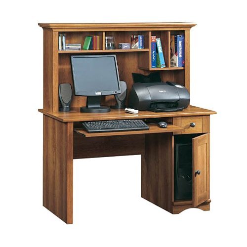 Sauder 188136 Computer Desk Features: -American Cherry finish. -Top quality medium-density construction. -Keyboard/mouse shelf and drawer feature metal runners and safety stops. -Drawer features patented T-lock assembly system. -Storage area behind door holds a vertical CPU tower. -Hutch has cubbyhole and vertical storage compartments. -Quick and easy assembly with patented slide-on moldings. Specifications: -CPU Opening Dimensions: 18.75" H x 10.75" W x 21.75" D. -Overall Dimensions: 54.625" H x 47.5" W x 23.5" D.